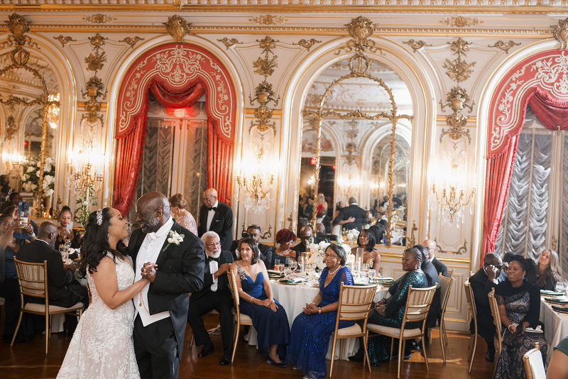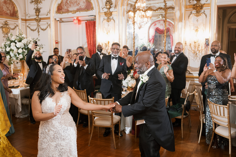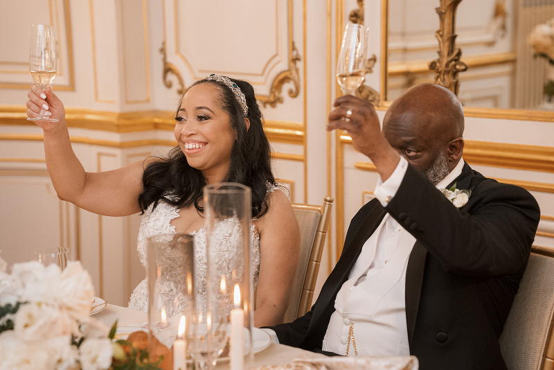 Once guests were seated, the newlyweds shared their first dance. Touching parent dances and heartfelt speeches followed soon after. The evening flowed seamlessly from dinner to cake cutting to a lively night of dancing. Every element of this Cosmos Club wedding reflected the couple’s joy, faith, and signature elegance.